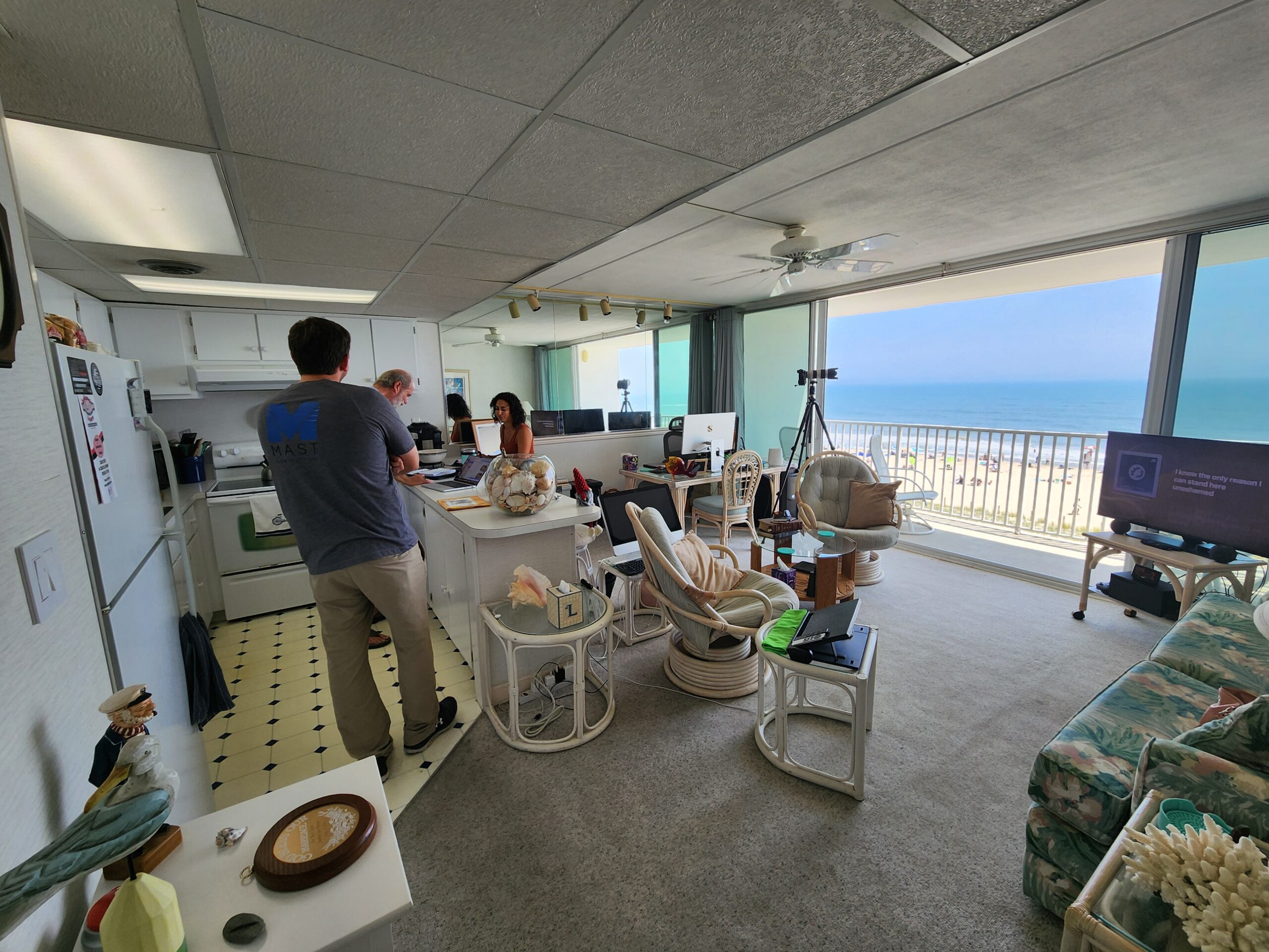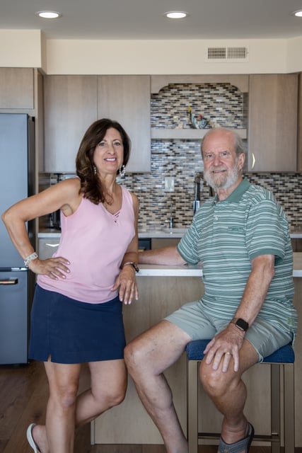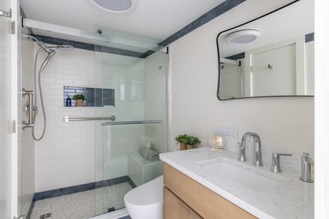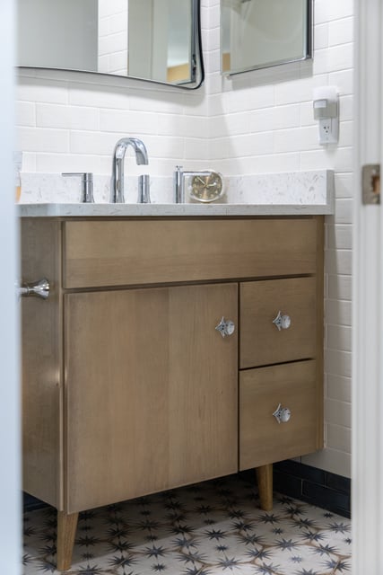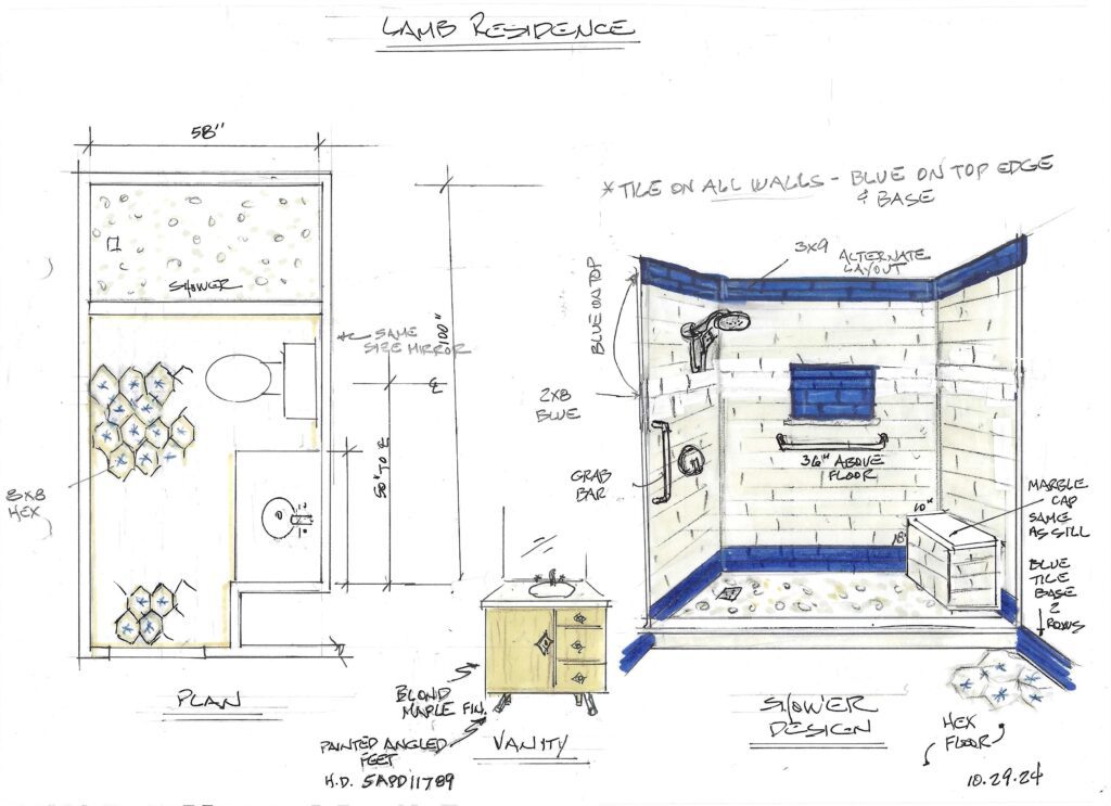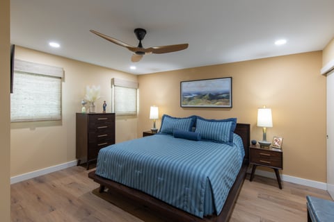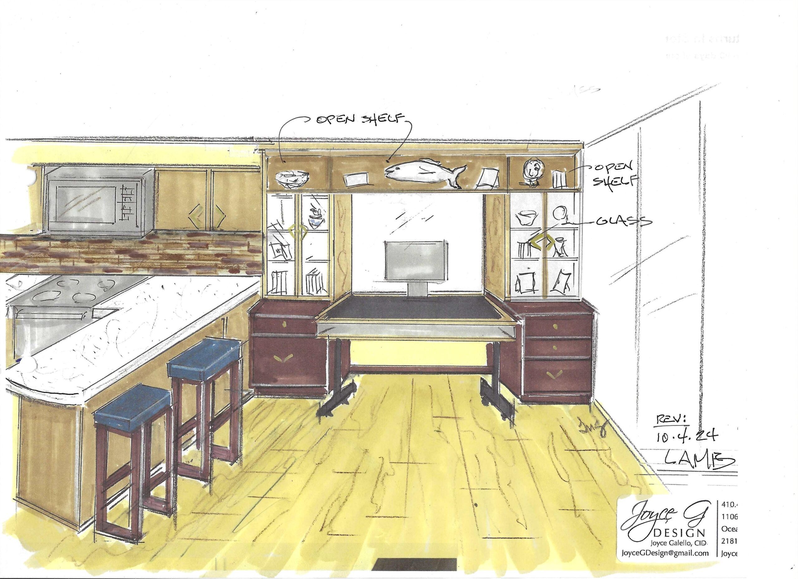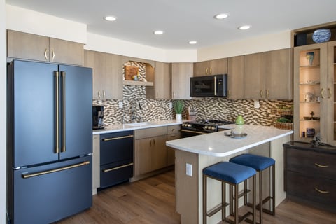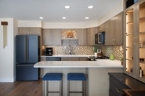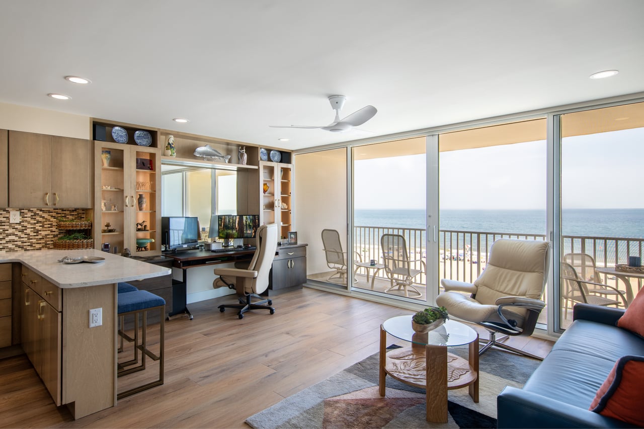 I consider every client I work with a wonderful gift. When this kind gentleman reached out to me to renovate his condo at Sea Gate in Ocean City, MD, I was grateful to take it on. When he told me he wanted the style to be Mid-Century Modern, I jumped for joy! How much fun it was to go back in time and create an environment similar to what Marc and I grew up with bringing many warm memories to mind. Together with my daughter, Michelle (who had her first experience with Mid-Century) we pulled together our concept. Using all new furniture and finishes we incorporated blues and browns, natural flush cabinet doors with “boomerang” cabinet pulls, angled tell-tale furniture feet, natural woods, while giving space to modern appliances. We also incorporated modern Apple technology where Marc can command the lights to go on, the blinds to open, the TV to turn on and more. And of course, we had to grace the home with a modern-day toilet washlet!!